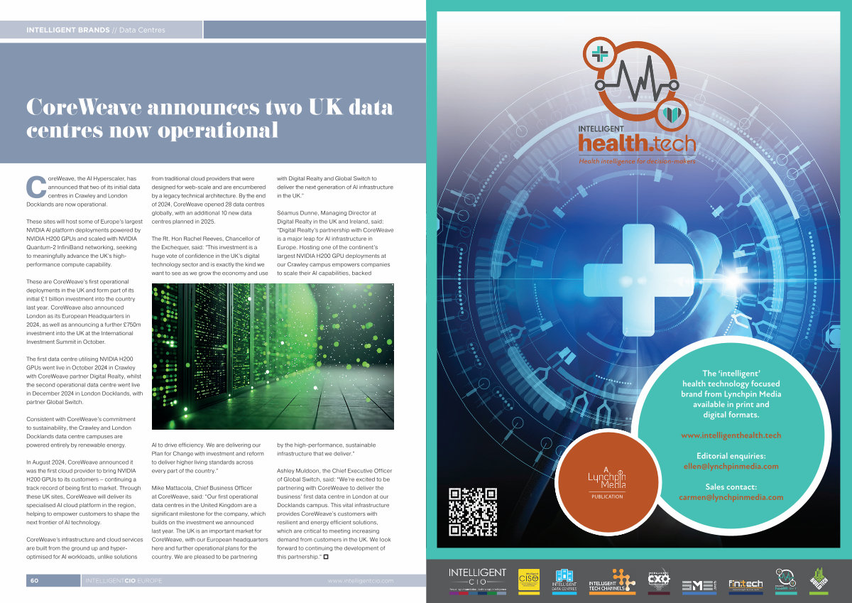 Mike Mattacola , Chief Business Officer at CoreWeave , said : “ Our first operational data centres in the United Kingdom are a significant milestone for the company , which builds on the investment we announced last year . The UK is an important market for CoreWeave , with our European headquarters here and further operational plans for the country . We are pleased to be partnering by the high-performance , sustainable infrastructure that we deliver .”