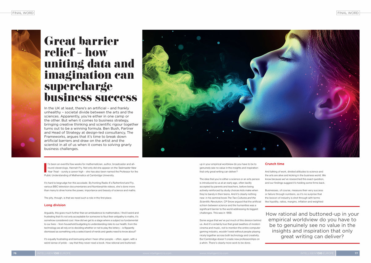 In the UK at least , there ’ s an artificial – and frankly unhealthy – societal divide between the arts and the sciences . Apparently , you ’ re either in one camp or the other . But when it comes to business strategy , bringing creative thinking and scientific rigour together turns out to be a winning formula . Ben Bush , Partner and Head of Strategy at design-led consultancy , The Frameworks , argues that it ’ s time to break down artificial barriers and draw on the artist and the scientist in all of us when it comes to solving gnarly business challenges .